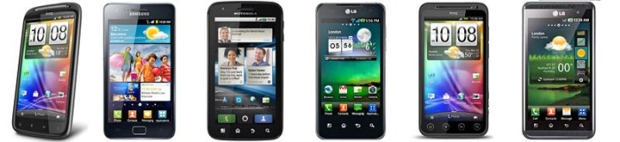 Από αριστερά προς τα δεξιά HTC Sensation, Samsung Galagy S II, Motorola Atrix, LG Optimus 2x, HTC EVO 3D, LG Optimus 3D