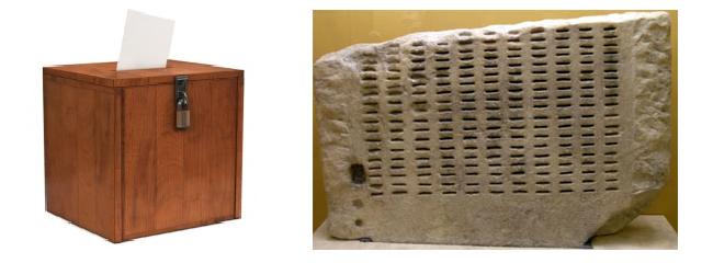 Αριστερά κάλπη, δεξιά μέρος αρχαίας κληρωτίδας